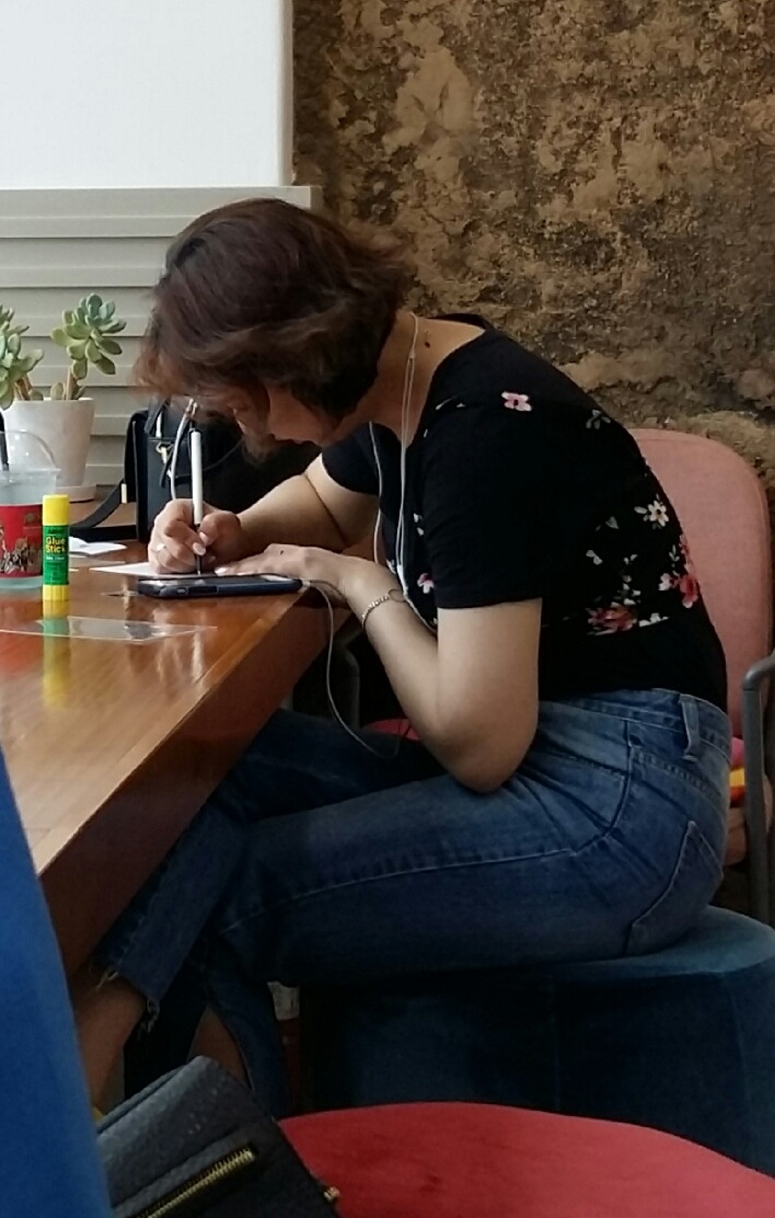 에메랄드 빛 바다가 보이는 창가에 앉아 편지를 쓰는 아가씨가 아름답다.